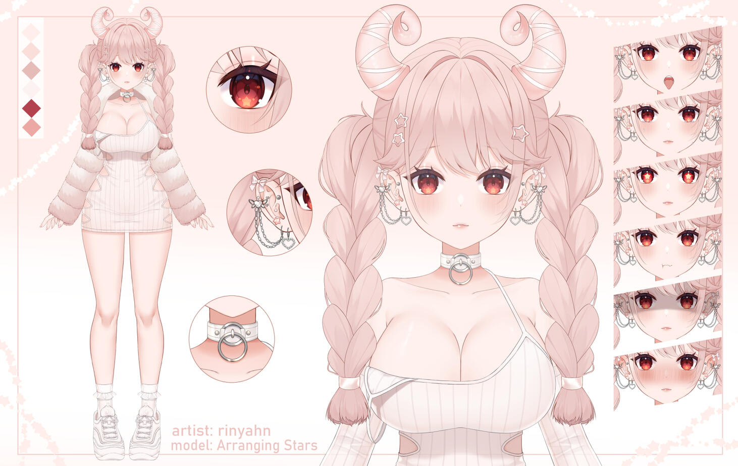 The cost of the model starts from $ 1300$ for a full body, depending on the complexity of the design it can be increased. This will include a finished .psd file, an .png file illustration and a few standard facial expressions (up to 5 and sticking out tongue). Additional details (options for hands, additional hairstyles, clothing, additional emotions, hands, plush or weapon) are discussed separately.